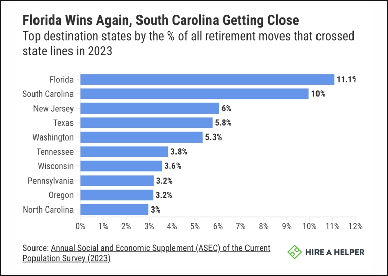 Washington ranked #5 with 5.3% of all such moves. No surprise that Florida was #1 at 11.1%, but I definitely wasn't aware that South Carolina was such a popular retirement destination. It was second at 10%. Here's the full top 10: